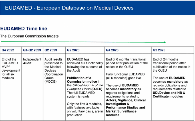 Moreover, an audit on EUDAMED will be conducted during the first quarter of 2024. Afterwards, the MDCG will assess the results of the audit. If the results of this audit are positive, the Commission will publish a notice in the Official Journal of the European Union. This action will lead to the release of the full EUDAMED system, therefore in that moment EUDAMED will become fully functional.