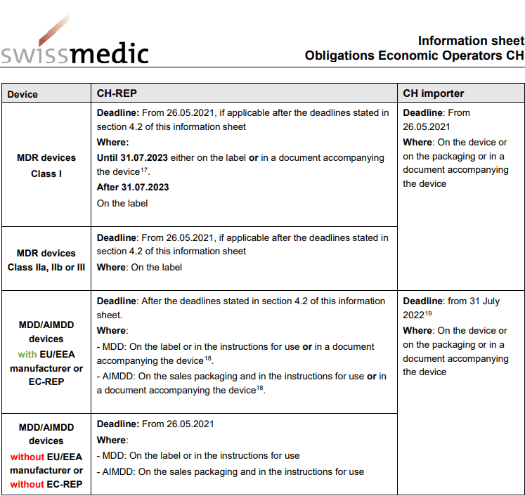 - The above requirement is also established for importers for MDR devices (all classes). Nevertheless, the CH-REP will still need to be indicated on the label, except for MDR Class I devices, which enjoy a transitional period until 31 July 2023 (the CH-REP indication on the delivery note/packing slip suffices). Swiss MedTech nevertheless recommends to already indicate the CH-REP on a device label, as part of the transition to the new Regulation.