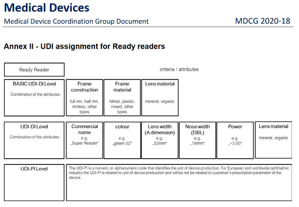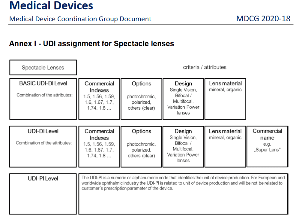 Taking into account the nature of Spectacle lenses and Ready readers and for the purpose of adding data to EUDAMED, the MDCG published a new Position Paper on the Basic-UDI-DI and UDI-DI groupings (Annexes I and II below), which are outlining BASIC-UDI level, UDI-DI level and UDI-PI level for both types of the device.